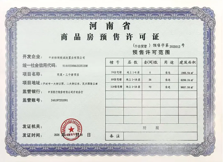 春日啟新程,捷報傳佳音。3月30日,鐵建投城發(fā)·三千著項目成功取得7#、8#、11#樓商品房預(yù)售許可證,為項目后續(xù)營銷工作開展奠定堅實基礎(chǔ)。